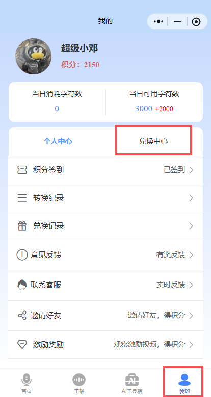 3.选择“我的” 页面,点击兑换